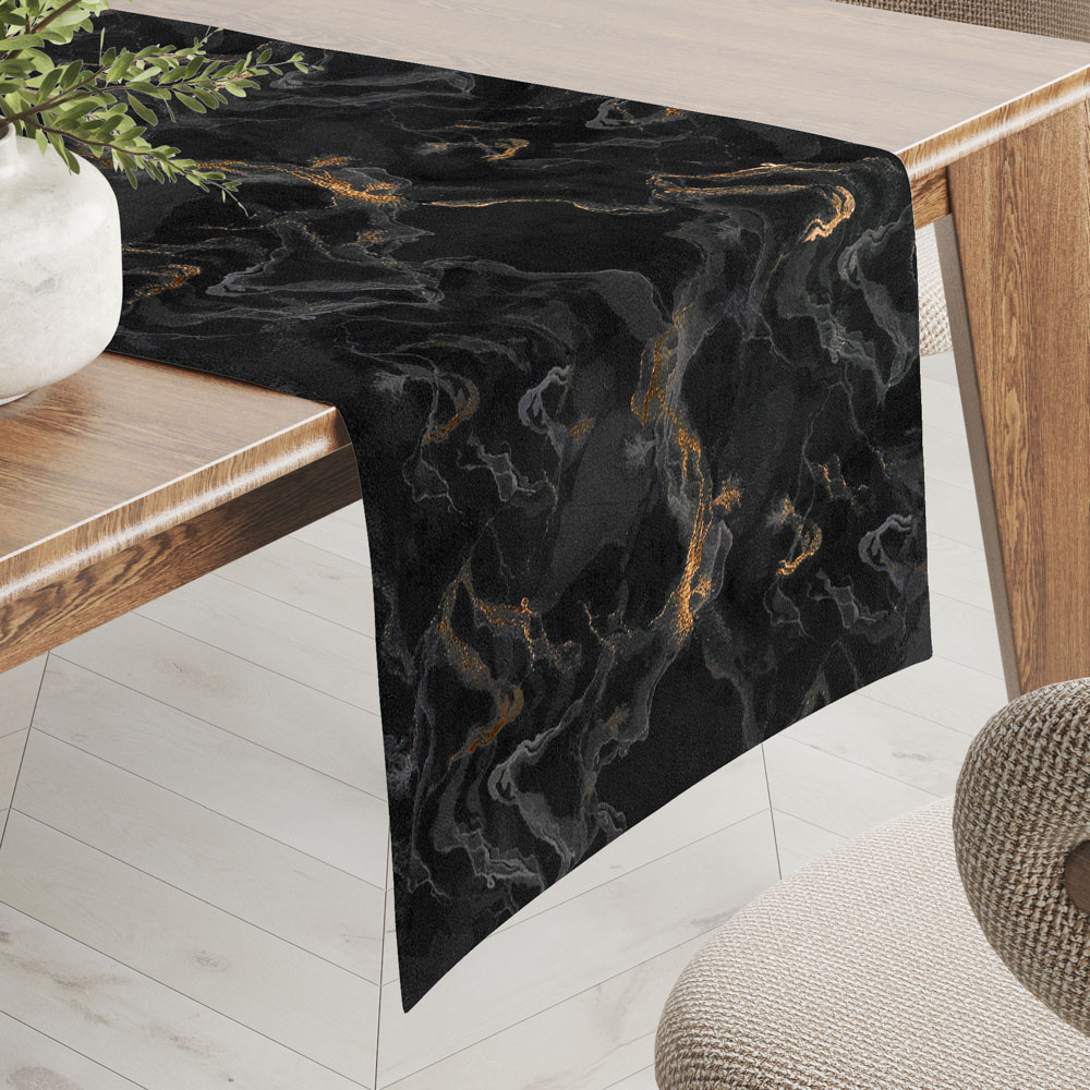 Luxusní sametový dekorační běhoun na jídelní stůl s mramorovým vzorem ve zlaté a kouřové barvě na černém podkladu, vyrobený z kvalitní látky Isabela o gramáži 260 g/m2. Látka Isabela je semišově hebká jednostranná látka s luxusním vzhledem, na dotek velmi příjemná.