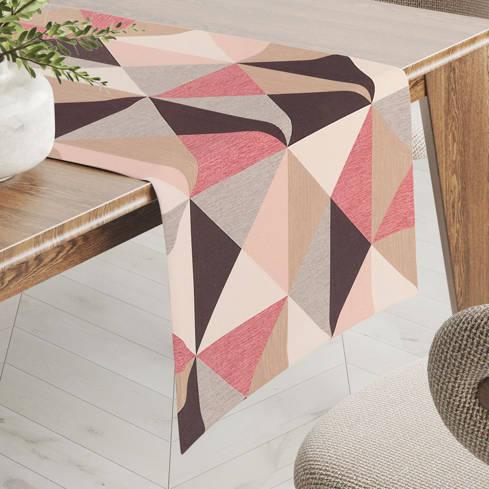 Dekorační běhoun na jídelní stůl, vyrobený z hebké a příjemné sametové látky Tamara s digitálním tiskem, se vzorem trojúhelníků lososově růžové, červenorůžové, béžové, šedobéžové a tmavě hnědé barvě. Látka Tamara je vyrobena ze 100% polyesteru, o gramáži 220 g/m2.