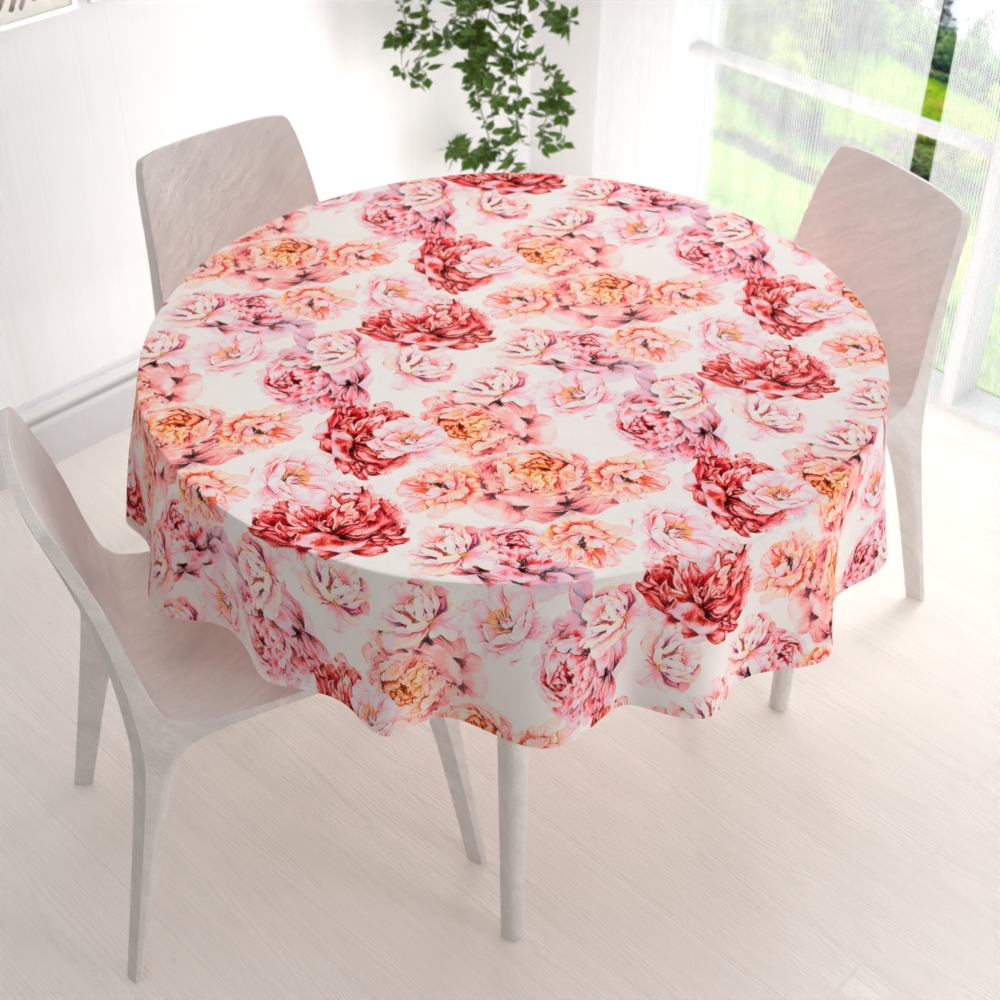 Dekorační kulatý ubrus na jídelní stůl, vyrobený z hebké a příjemné sametové látky Tamara s digitálním tiskem, se vzorem růžovo-červených pivoněk na bílém podkladu. Látka Tamara je vyrobena ze 100% polyesteru, o gramáži 220 g/m2.