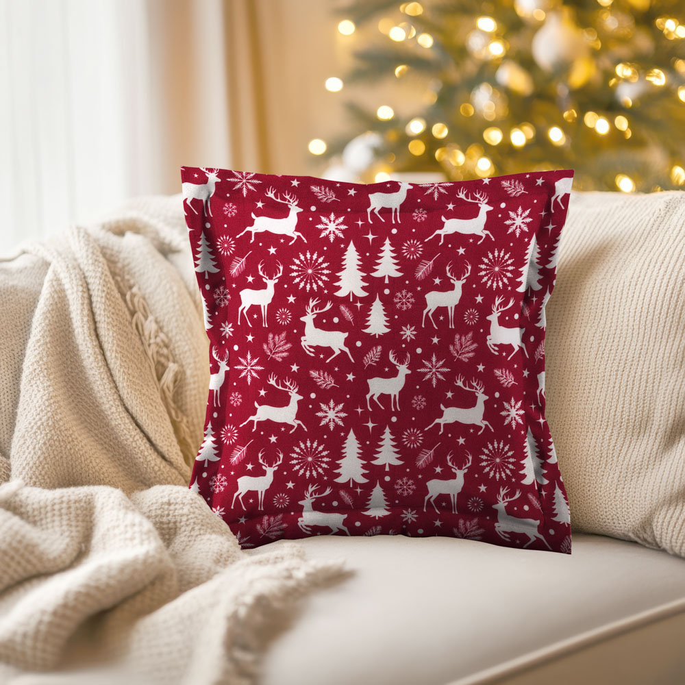 Dekorační povlak na polštář s ozdobným lemem, vyrobený z hebké a příjemné sametové látky Tamara s digitálním tiskem, s vánočním vzorem bílých jelenů a stromků na červeném podkladu. Povlak je ušit ze sametové látky Tamara ze 100% polyesteru, o gramáži 220 g/m2.