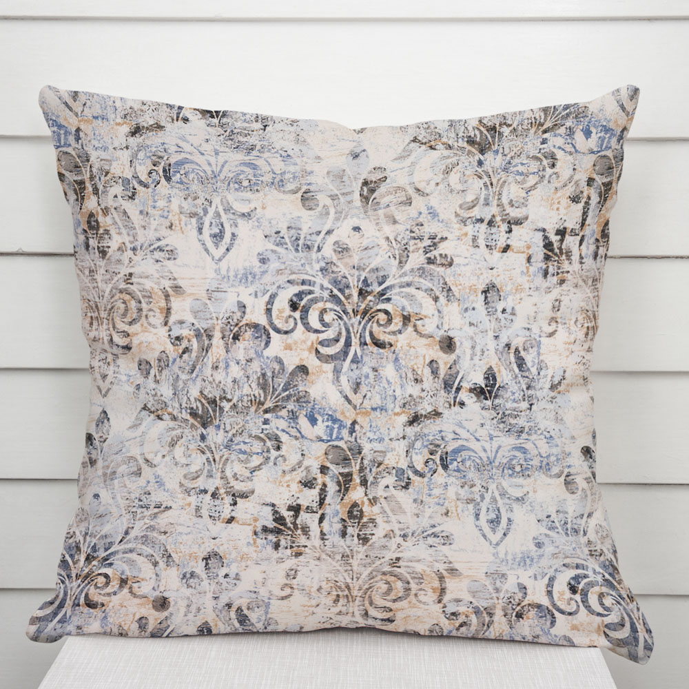 Dekorační povlak na polštář, vyrobený z hebké a příjemné sametové látky Tamara s digitálním tiskem, se zámockým vzorem v modro-zelené barvě na krémovém podkladu. Povlak je ušit ze sametové látky Tamara ze 100% polyesteru, o gramáži 220 g/m2.
