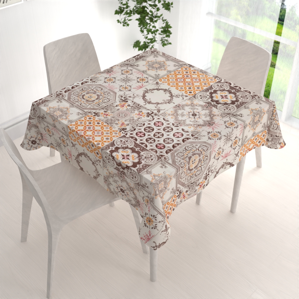 Bavlněný čtvercový dekorační ubrus na velký jídelní stůl se vzorem hnědých dlaždic s ornamenty na krémovém podkladu. Je ušitý z hustě tkaného 100% bavlněného plátna s certifikátem zdravotní nezávadnosti Oeko-Tex 100. Ubrus dodáváme kompletně obšitý.