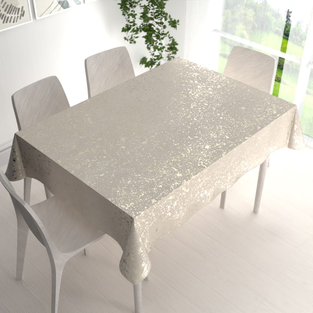 Sametový obdélníkový ubrus na velký jídelní stůl, se vzorem designových zlatých skvrn na krémovém podkladu, vyrobený z kvalitní látky Isabela o gramáži 285 g/m2. Látka Isabela je semišově hebká jednostranná látka s luxusním vzhledem, na dotek velmi příjemná.