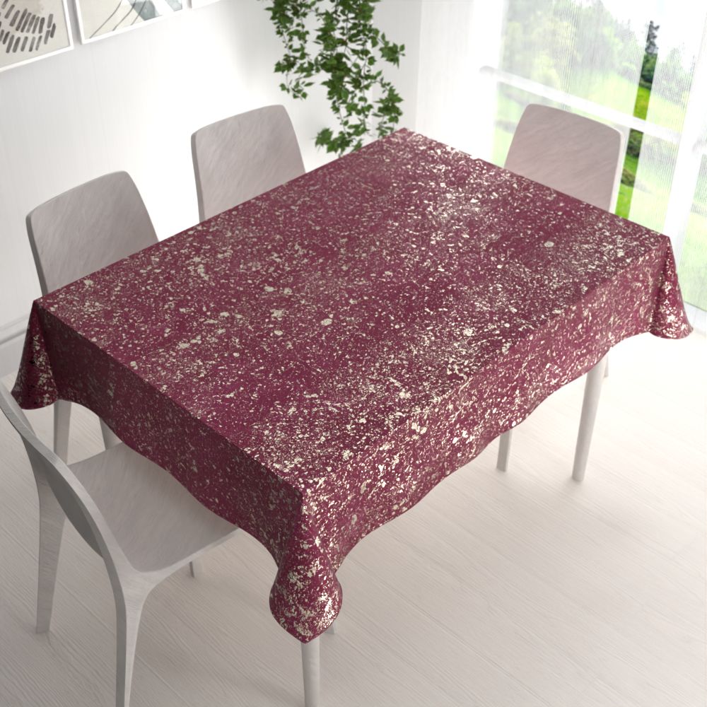 Sametový obdélníkový ubrus na velký jídelní stůl, se vzorem designových zlatých skvrn na vínovém podkladu, vyrobený z kvalitní látky Isabela o gramáži 285 g/m2. Látka Isabela je semišově hebká jednostranná látka s luxusním vzhledem, na dotek velmi příjemná.